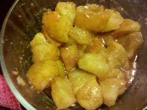 Let’s face it kids, winter’s upon us. It’s going to snow this weekend. Saying goodbye to the warmer season can be difficult in the diet-shifting arena and the cravings you may have had a month ago may be manifesting itself as a confused lump of indecision in front of the refrigerator, at that “I really shouldn’t be eating anything else this late” hour. I encountered this issue last night, as I scavenged for my post-dinner mini-meal. I wanted something comforting, warm, potentially sweet, but not hot chocolate – tryin’ to watch my girlish figure – I wanted savory, but not salty. I eventually identified the desire to have an apple, yet that didn’t completely appeal to me because I was cold. Thus, my brainchild came to life:
