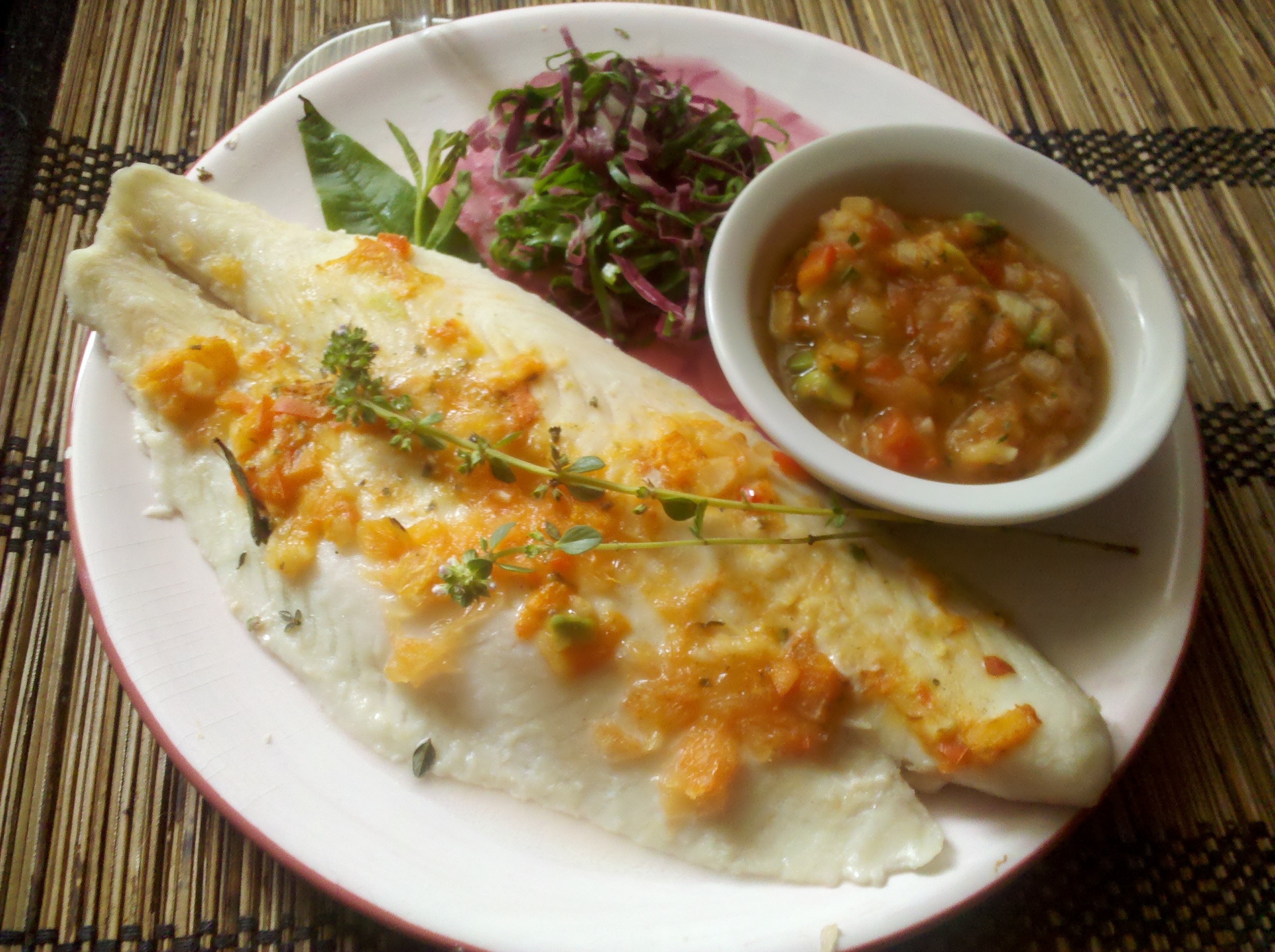 In a shallow pan or bowl, marinate about 1 lb of white fish fillets in a mixture of fresh grapefruit juice, sea salt, white pepper and 2-3 tablespoons of apricot salsa for 15-20 minutes. Remove the fillets from marinade and arrange in a broiler pan (I lined mine with foil for easy cleanup and sprayed it with canola spray). Spoon the leftover marinade over the fillets and perhaps add a little extra salsa. Cover the fish and bake at 350 degrees for 15 minutes. Remove from oven to check and put it right back in, this time to broil on high for 8-10 minutes, until a little brown and crispy on the edges. Serve with some grilled zucchini.