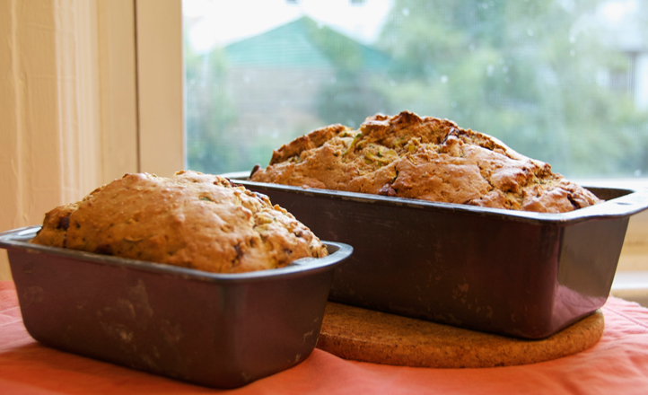 A former neighbor of mine was the first in the neighborhood to introduce herself to me. She came bearing a loaf of homemade bread made with zucchini from her own amazing garden. Since then, I have been making this bread throughout the summer with the zucchini from my CSA, My family loves it (especially with chocolate chips!), and so do I. This recipe yields more than one of my bread pans holds, so I also make a mini loaf that I freeze and bring for breakfast when we go camping.