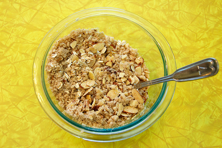 Pulse flour, sugars, cinnamon and salt in a food processor. Add the butter and pulse 5 times more for 4 seconds each. The mixture should look like clumpy sand. Don’t overmix or the topping will be wet and homogeneous. Fold in almonds and oats. Refrigerate for 15 minutes.
