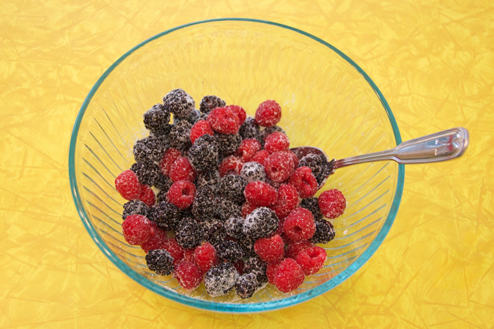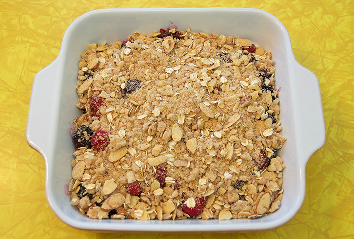 Toss the berries with the sugar. Scrape into an 8×8” square baking dish. Distribute chilled topping over the fruit.