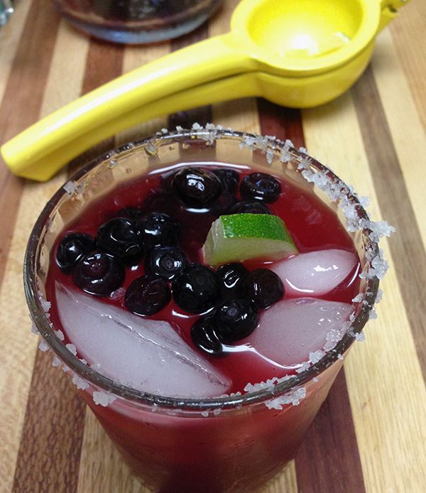 Pour the drinks in glasses rimmed with salt (if desired) and filled with ice. Spoon the remaining berries on top and garnish with a lime wedge.