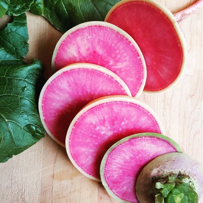 Watermelon Radish – A surprise awaits you when you slice into these radishes. They are delicious sliced raw, as a slaw, or roasted in the oven. If you peel them lightly and leave a bit of the green flesh, they really do resemble slices of watermelon!